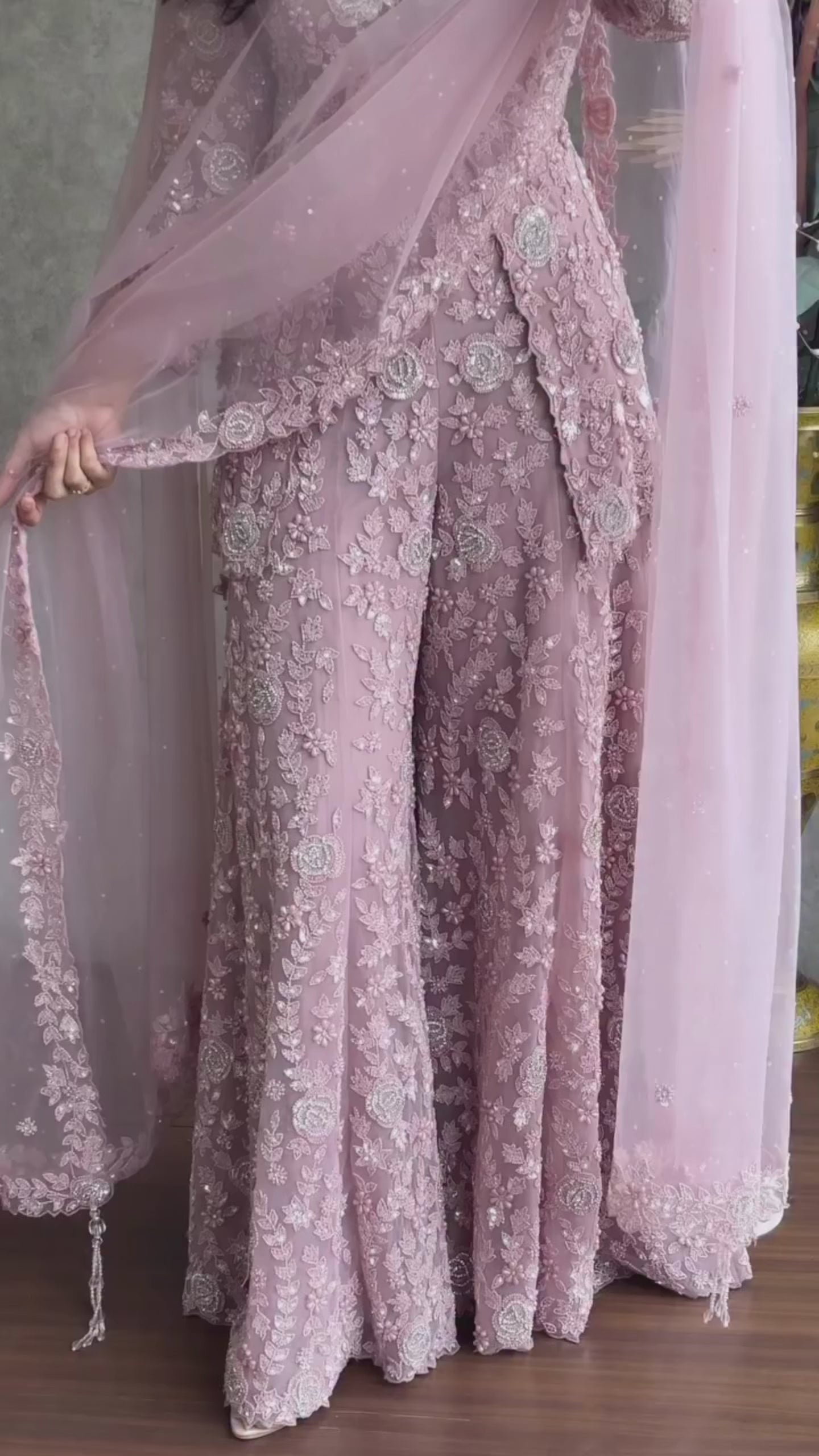 Beige Tabby Organza Mukesh Work Palazzo Set