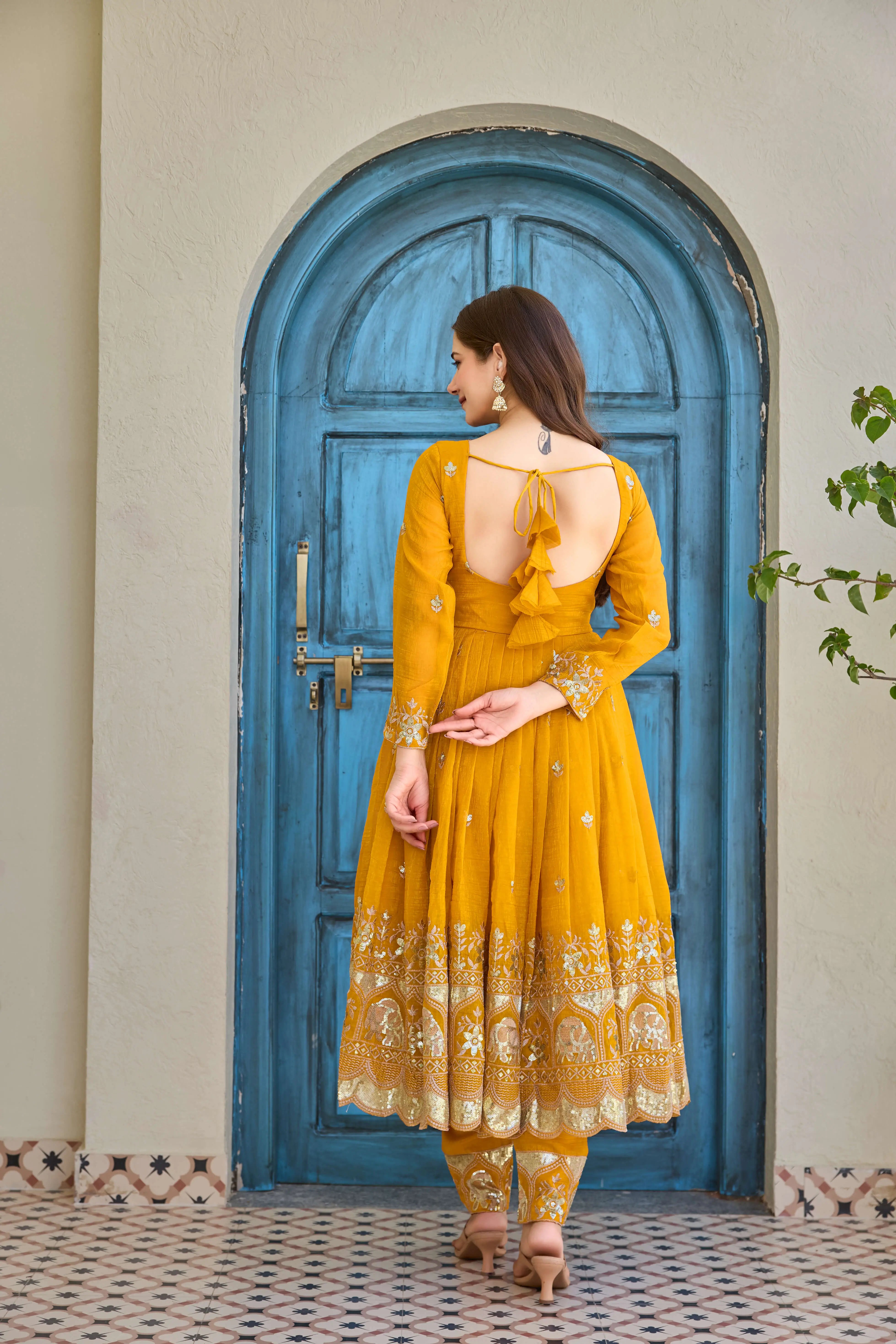 Make a royal festive statement with this elegant maroon Anarkali set, beautifully showcased through our own real-model shoot for a premium boutique presentation. Crafted in heavy crunchy silk and adorned with designer sequin and thread embroidery, this ensemble blends traditional charm with modern sophistication.