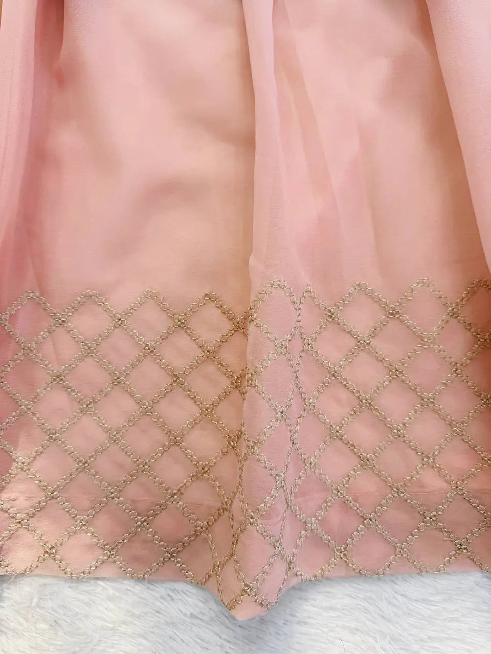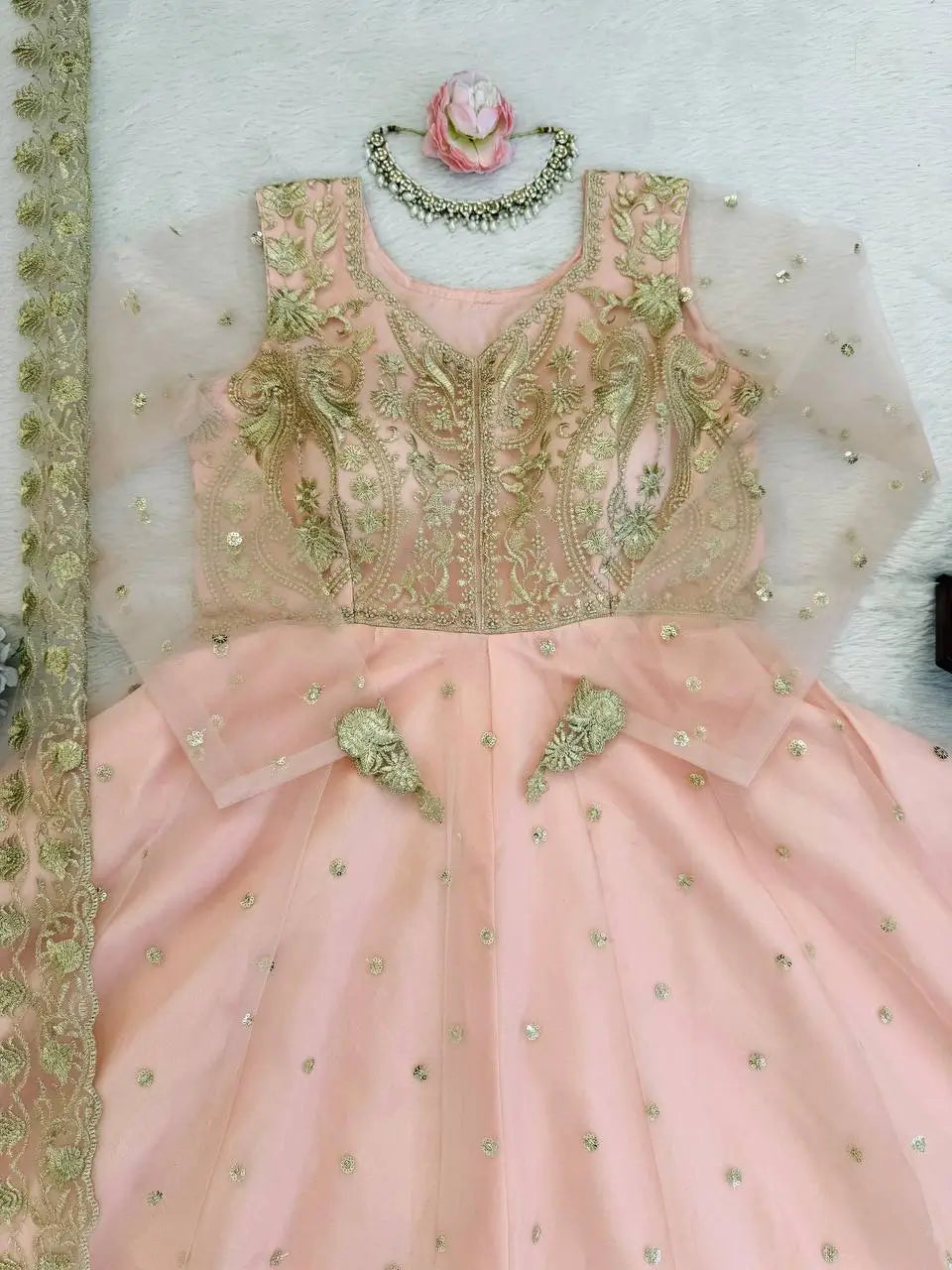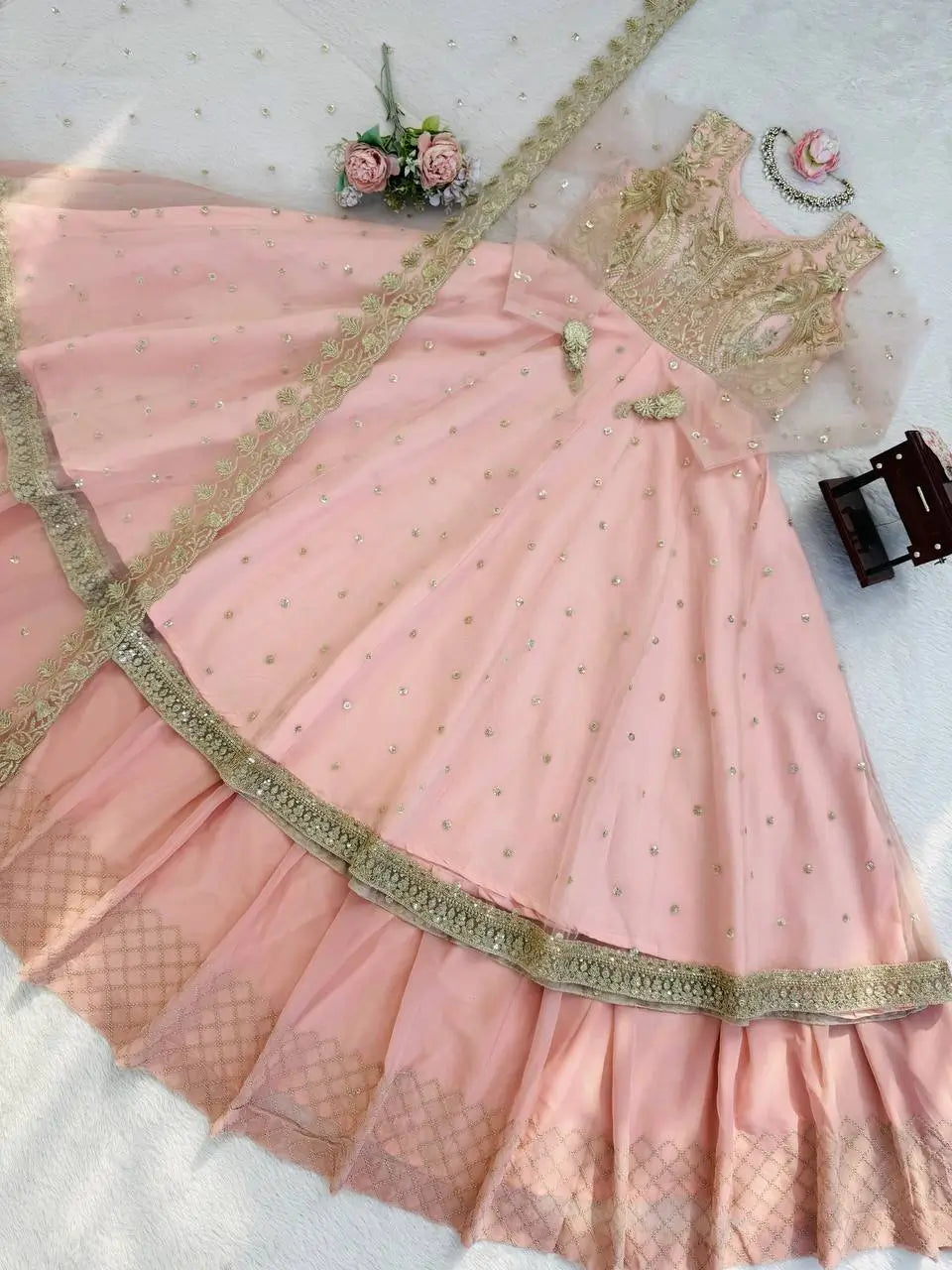 Step into graceful elegance with this beautiful blush pink gown lehenga set designed for modern festive styling. Crafted in premium faux georgette and enhanced with delicate thread and sequin embroidery, this ensemble blends comfort with sophisticated charm, making it perfect for celebrations and special occasions.