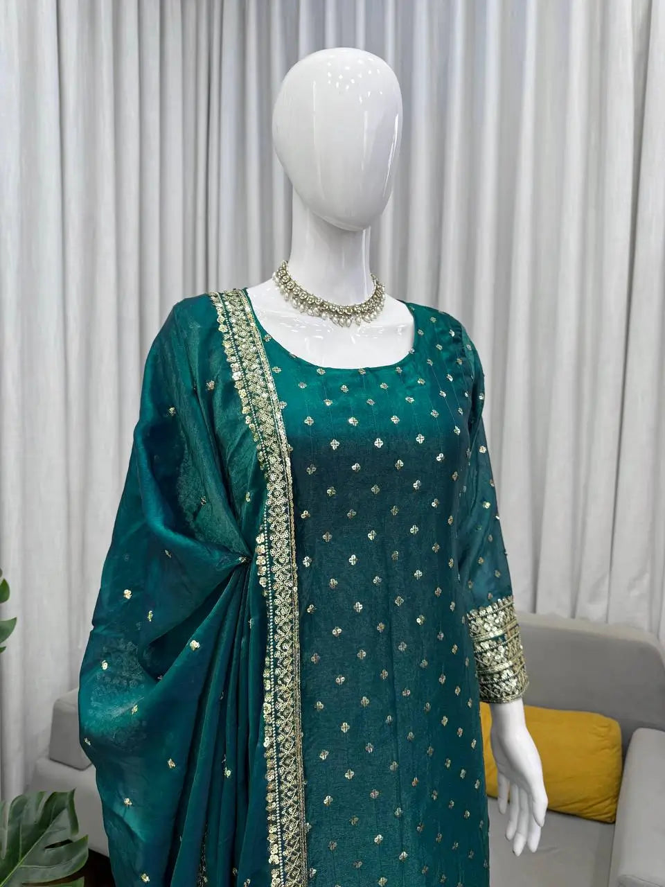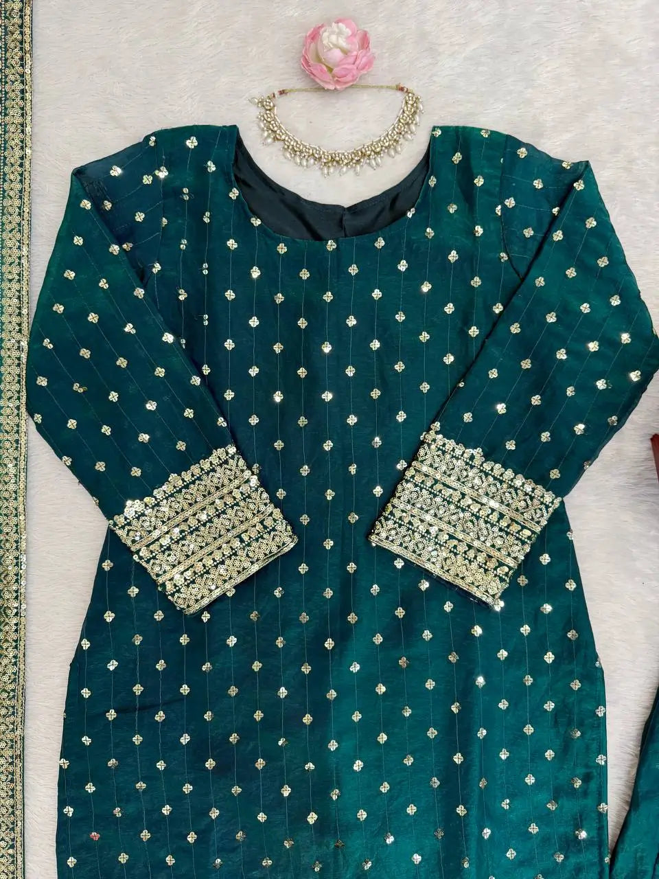 Step into timeless elegance with this stunning emerald green kurta pant set designed for graceful festive styling. Crafted in premium heavy Fendy silk and adorned with delicate thread embroidery and sequin highlights, this ensemble offers a beautiful blend of traditional charm and modern boutique sophistication.