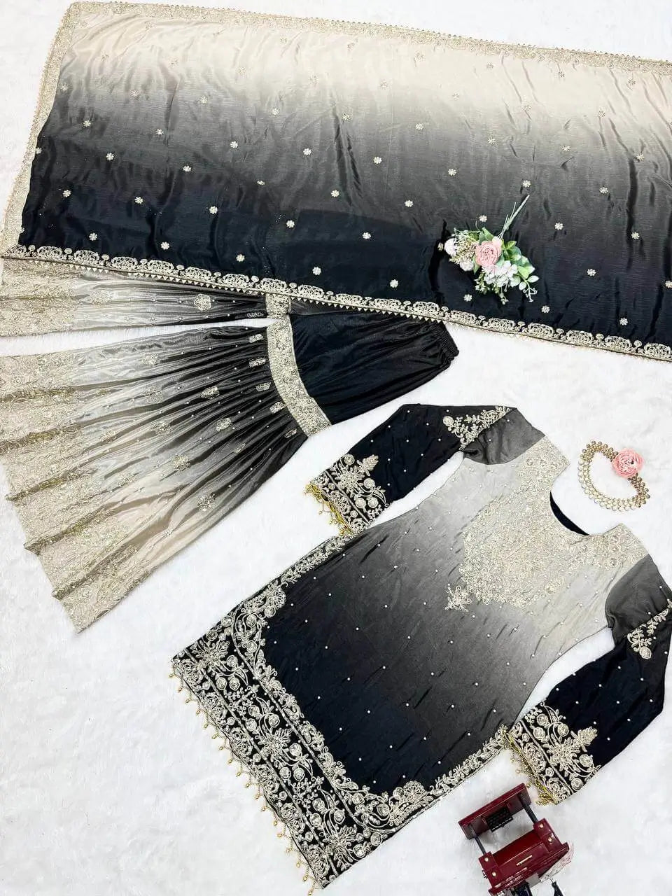 Make a sophisticated statement with this elegant ombre grey Chinon silk plazo set, beautifully styled with our own real-model shoot for a premium boutique finish. Designed with intricate coding dori, sequin, and rivet moti work on both front and back, this ensemble blends modern elegance with festive charm.