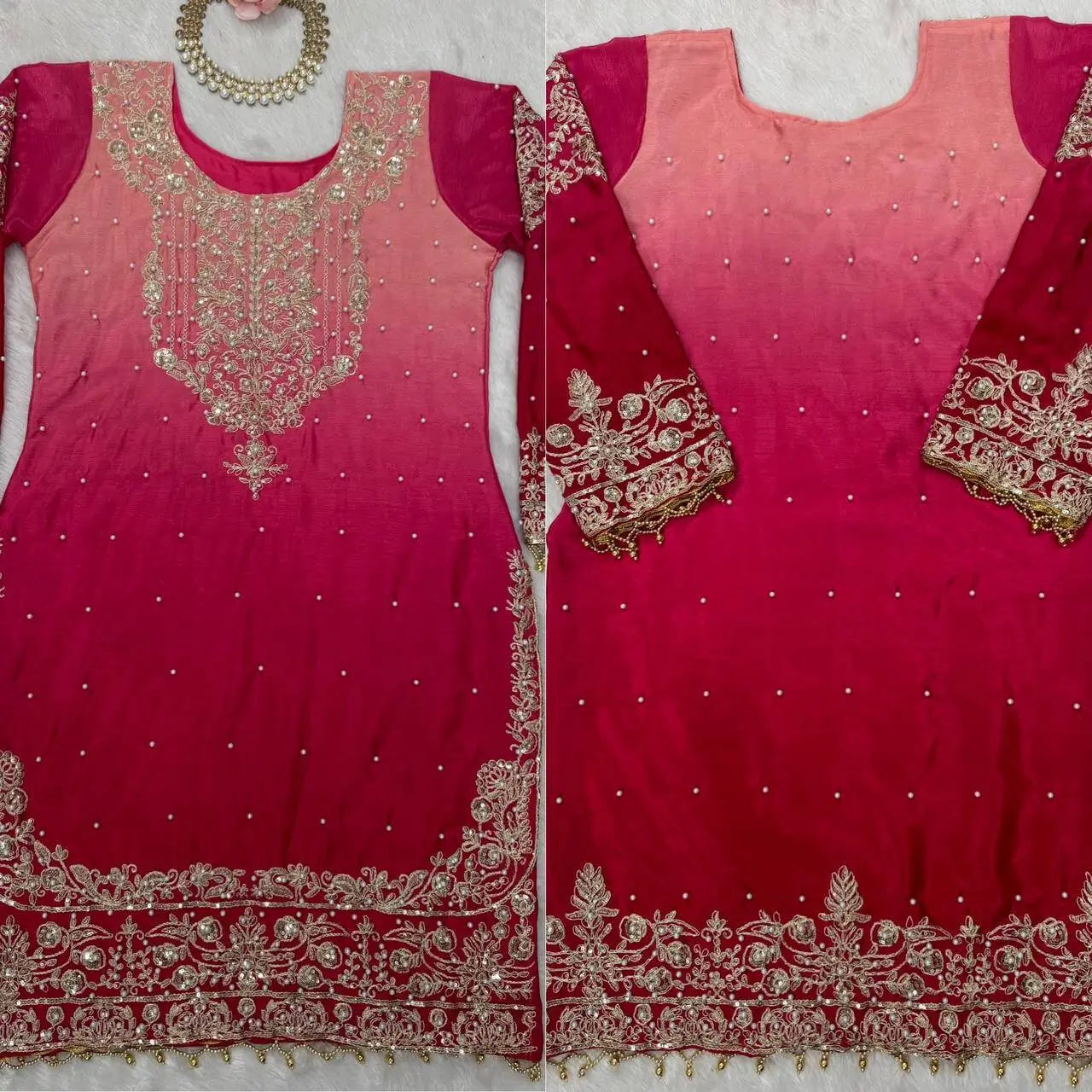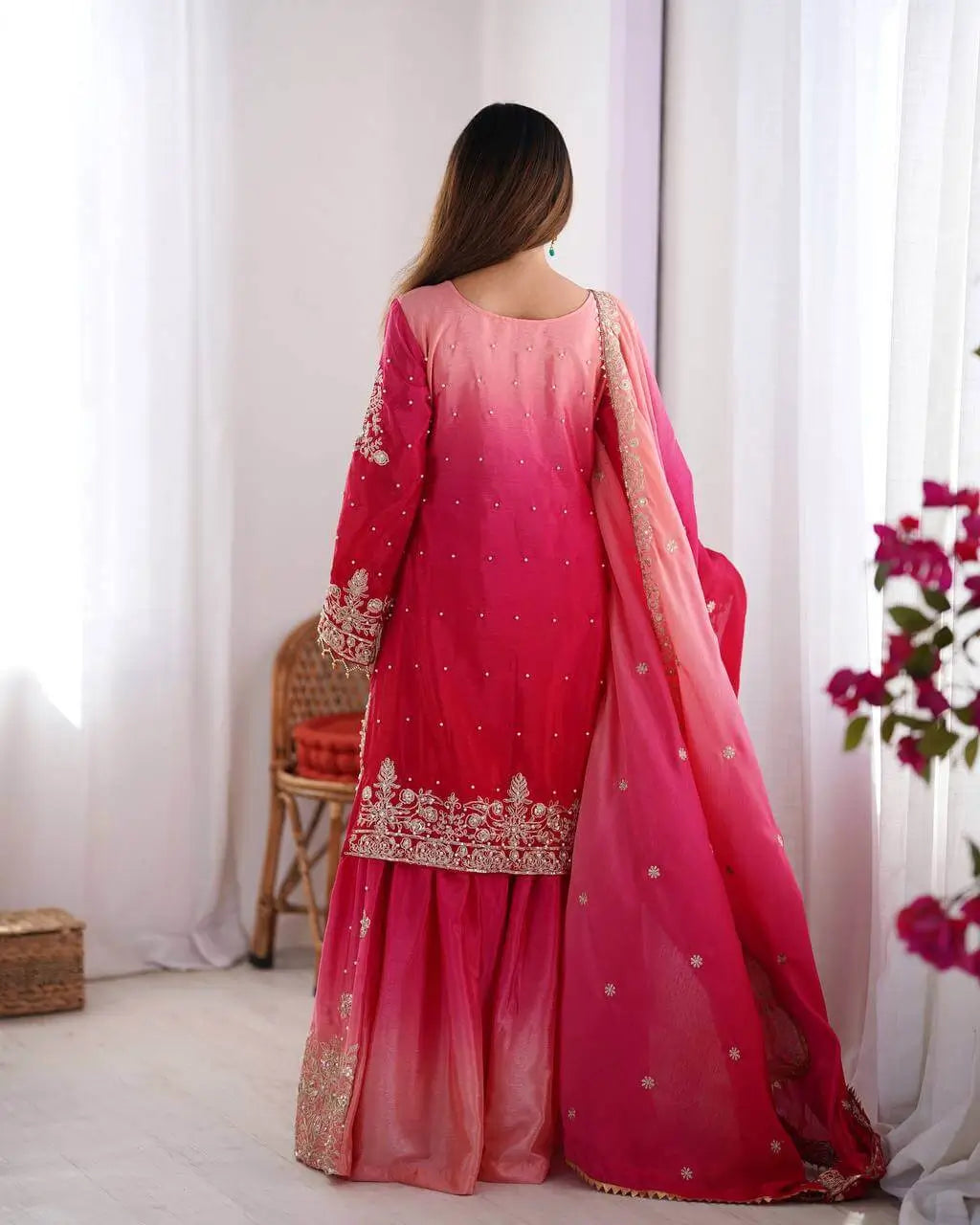 Add feminine elegance to your festive collection with this beautiful pink ombre Chinon silk plazo set, styled with our own real-model shoot for a premium boutique look. Designed with intricate coding dori, sequin, and rivet moti work on both front and back, this ensemble blends soft charm with festive sophistication.
